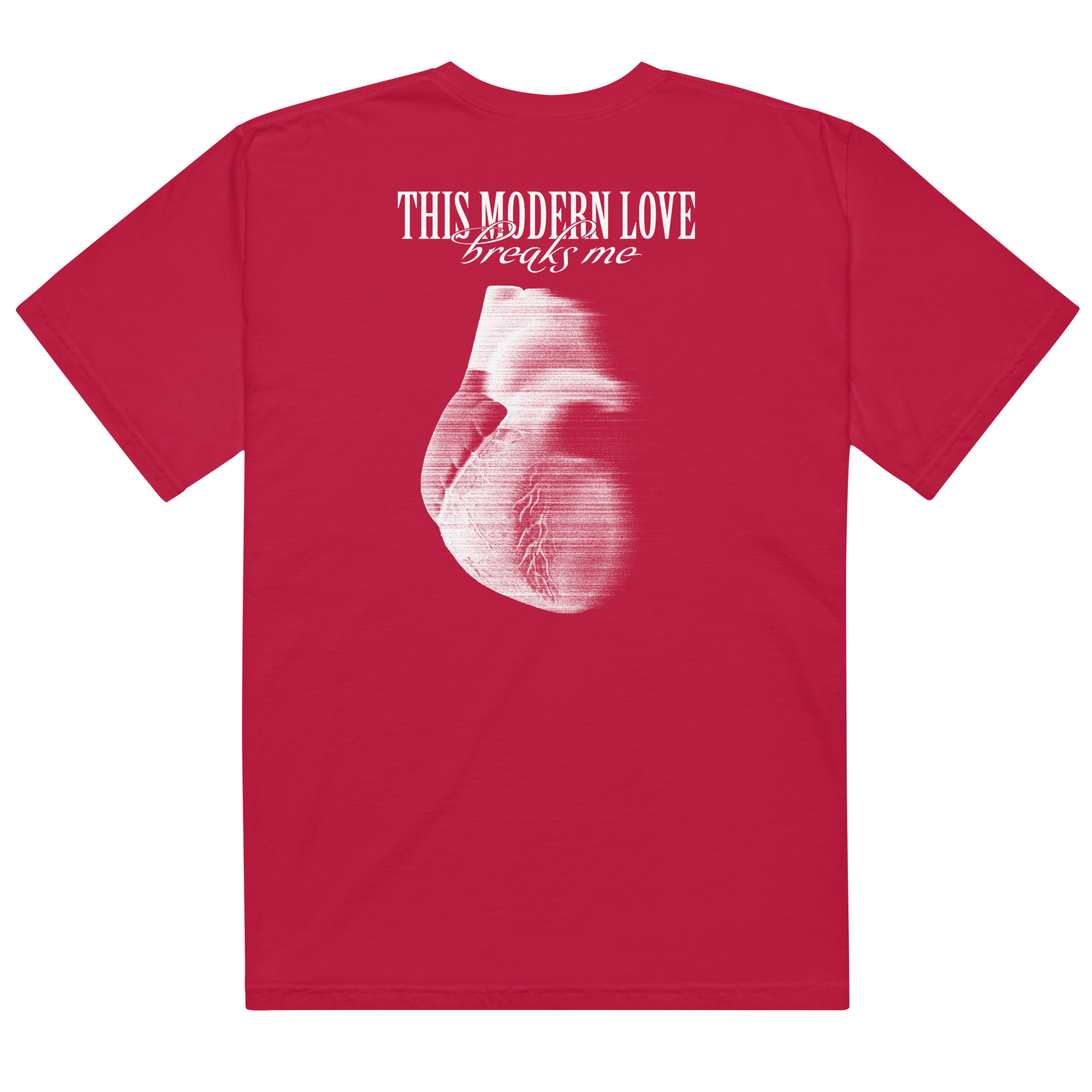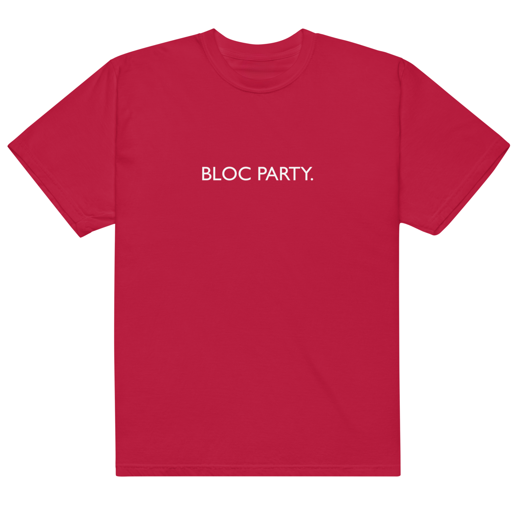 Classic red tee featuring Bloc Party logo on front chest and "This Modern Love" artwork on center back.